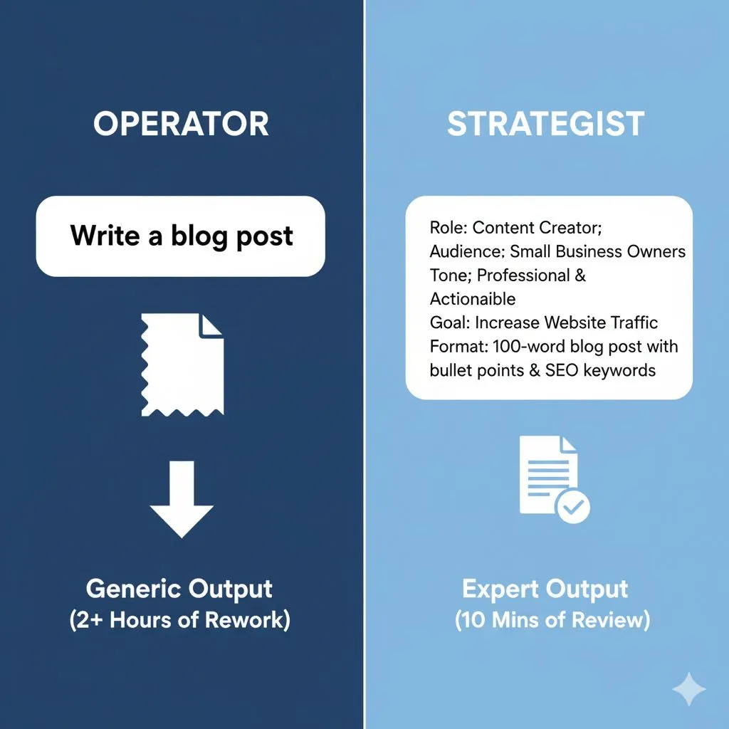 An Operator (the overworked business owner) uses a simple prompt and hopes for the best. They are reacting to the AI.